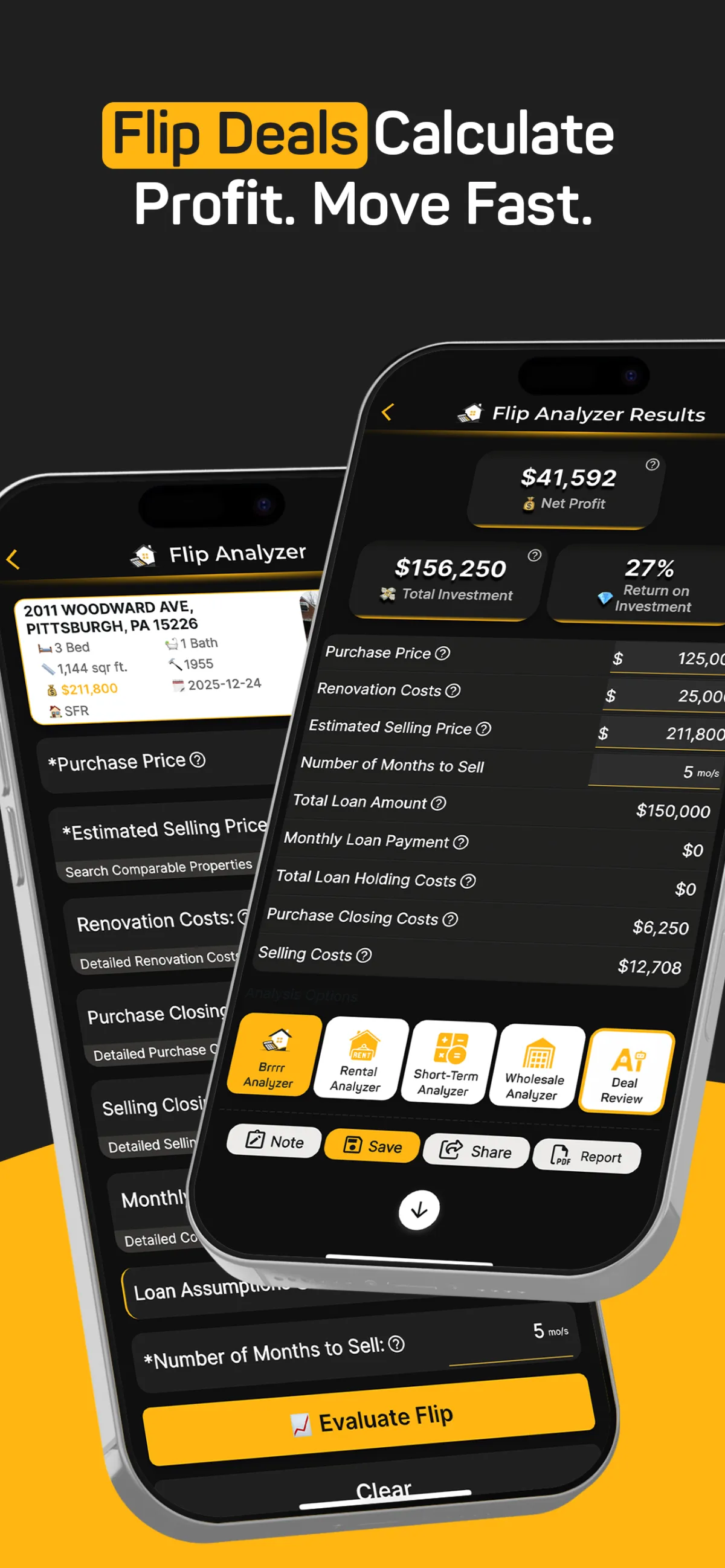 Every investor has a different approach. Customize your deal inputs from purchase price and rehab budget to financing structure, holding time, and rent income. It’s your deal, done on your terms.